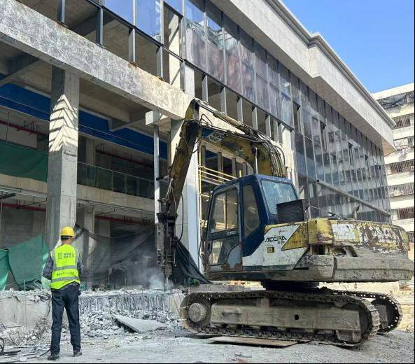 在“金葉匯”商業(yè)綜合體項目現場(chǎng),玻璃幕墻安裝已封頂,工人正在對塔吊承臺進(jìn)行破除,后續將做好公共區域裝飾裝修、機電安裝等收尾工作,沖刺全面竣工驗收節點(diǎn)。